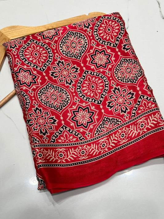 New Ajrakh Modal Silk Ajrakh Fancy Pallu Saree Available in modal silk ajrakh natural mill...