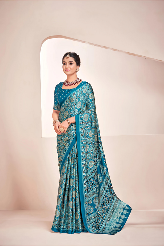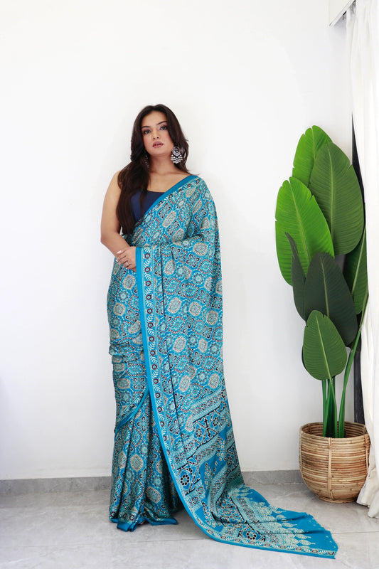 Blue Ajrakh Gajji Silk Ajrakh Fancy Pallu saree Available in Gaji silk Ajrakh natural mill...