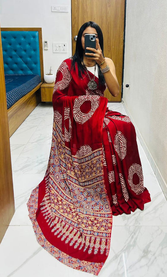 Red Ajrakh Gajji Silk Ajrakh Fancy Pallu saree Available in Gaji silk Ajrakh natural mill...